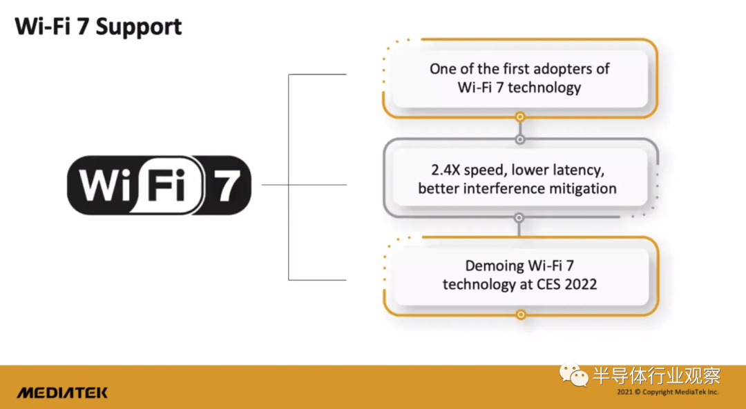 在最近的联发科技术峰会上,联发科调侃称将在CES2022展示下一代Wi-Fi网络技术Wi-Fi 7。联发科指出,Wi-Fi 7将比Wi-Fi 6E快2.4倍,带来更快的速度、更低的延迟和更好的抗干扰能力。