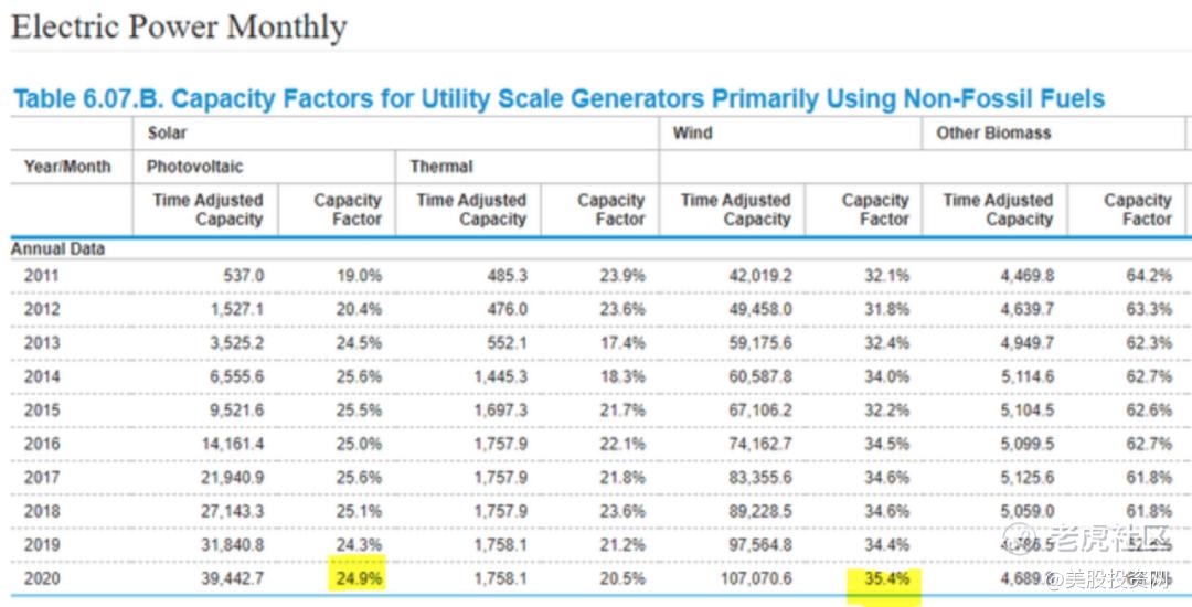 美国能源信息署列出了太阳能和风能的平均容量系数,它们分别为 24.9% 和 35.4%。