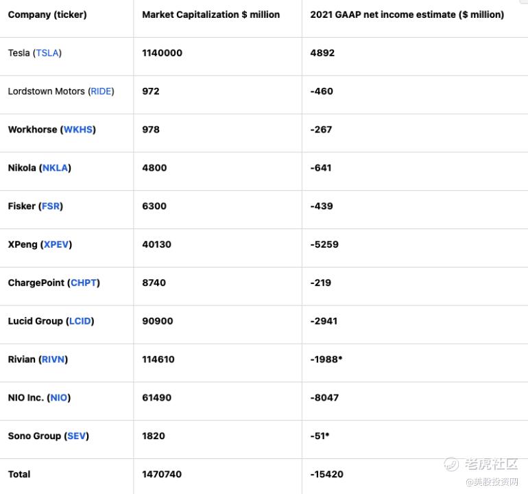 从技术角度来看,不得不承认错了,因为股票价格大幅上涨。然而,从根本上说,这个论点得到了支持。市值越高,总盈利能力越负,这使得基本价值和市场价值之间的脱节变得异常巨大。下面是今天的电动汽车制造商。