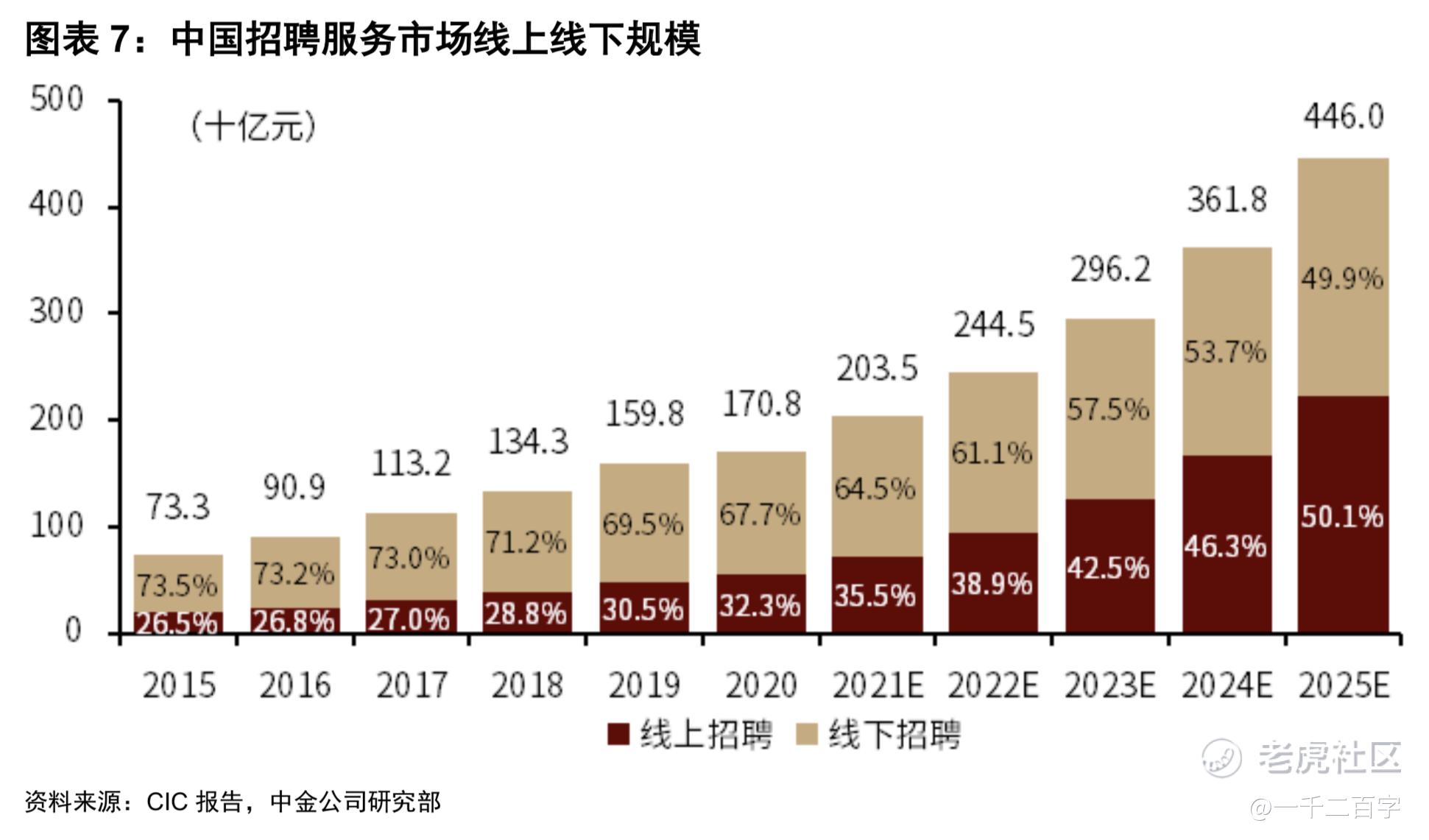 Recruit能在日本发展一家独大有其环境和历史的特殊性。国内的市场更分散,竞争也更激烈,但不大存在一家独大的时机。但就像仍有大量中小企业没有尝试数字化转型一样,仍有大量用工场景是通过线下熟人介绍完成,特别是蓝领市场蕴藏机会。据中金公司研报,截至2020年我国就职者中白领、蓝领、金领的人口数分别为1.8亿、3.9亿、1240万,其中蓝领市场的结构性变化将对招聘市场产生较大影响。比如对招聘成本更加敏感、换工作频率更高、招聘需求更分散、求职链条要求更快速反馈等,都把蓝领招聘往线上赶,这也是带动整个招聘市场在线化比例提升的最重要一层。