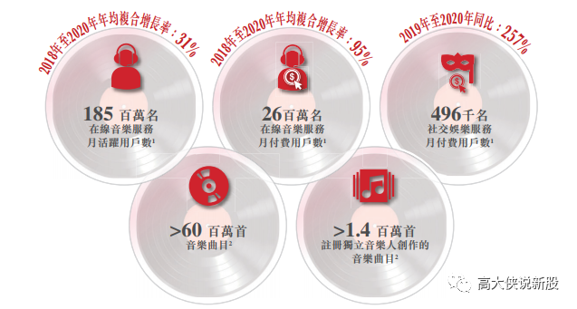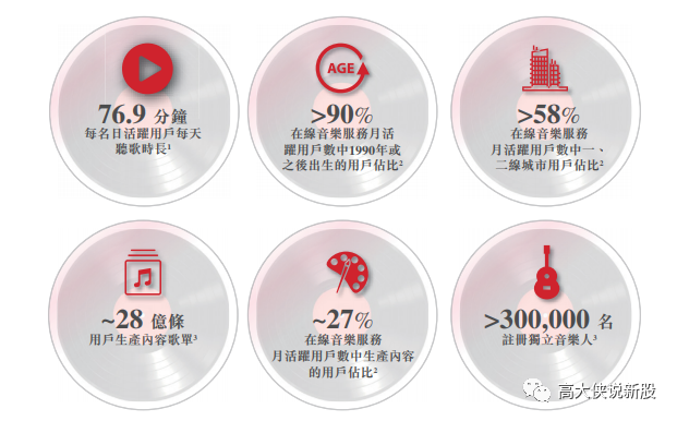 网易云音乐:发行估值394~457亿港币,截止今年6月30号收入31.83亿人民币,净利润-38亿(未调整前),在线音乐付费用户2429万,平均月活跃用户1.8亿,平均付费率8.8%,市场占比20.5%。