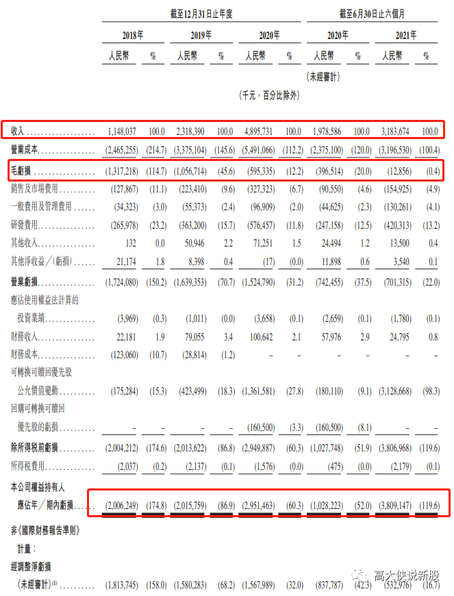 毛利:2018至2020年毛利分别为亏损-13.17亿,-10.56亿,-5.95亿元人民币;020至2021年首6个月毛利亏损分别3.96亿,1.28亿元人民币。