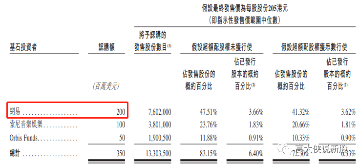 基石:共引入三名基石投资者,网易认购2亿美元,索尼音乐娱乐认购1亿美元,Orbis Investments认购5000万美元,合共认购3.5亿美元(约27.27亿港元),按中间价计算,占比约83.15%,设6个月禁售期。