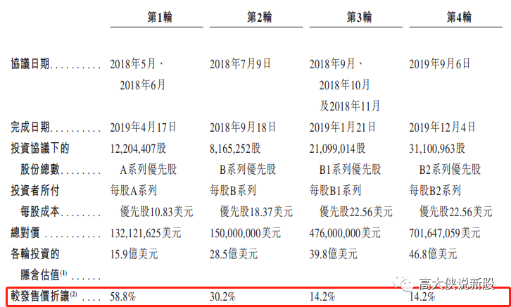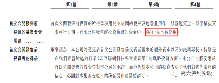 首次公开发售前投资:上市前在2018年至2019年曾进行多轮融资,前期投资者:CMC Capital、泛大西洋投资(General Atlantic)、百度、Boyu Capital、阿里巴巴、云锋基金等,较发售价中间价折让约14.2%至58.8%,且禁售180天。(最后一轮估值46.8亿美金,跟发行估值比涨幅不大,但云音乐明显钱不够烧了,上市前已经花了前期募资的64.4%,在不上就没钱烧了)