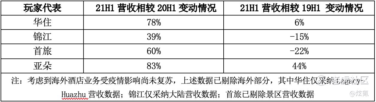 为此,我们拉取了华住、锦江、首旅、亚朵2021年上半年的营收数据,并将之分别与各自2020年上半年、2019年上半年的营收情况进行对比。考虑到华住、锦江在海外有酒店业务,但海外疫情防控情况与国内存在较大差异,所以我们已将华住、锦江海外酒店业务数据进行剔除。同时,首旅还存在景区业务,这部分不具有可比性,也予以剔除。