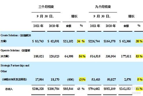 - Create Solutions 和 Operate Solutions 收入分别为 8370 万美元和 1.850 亿美元,比 2020 年第三季度分别增长了 34% 和 54%。战略合作伙伴和其他收入为 1760 万美元,比第三季度下降了 3% 2020 年第一季度。