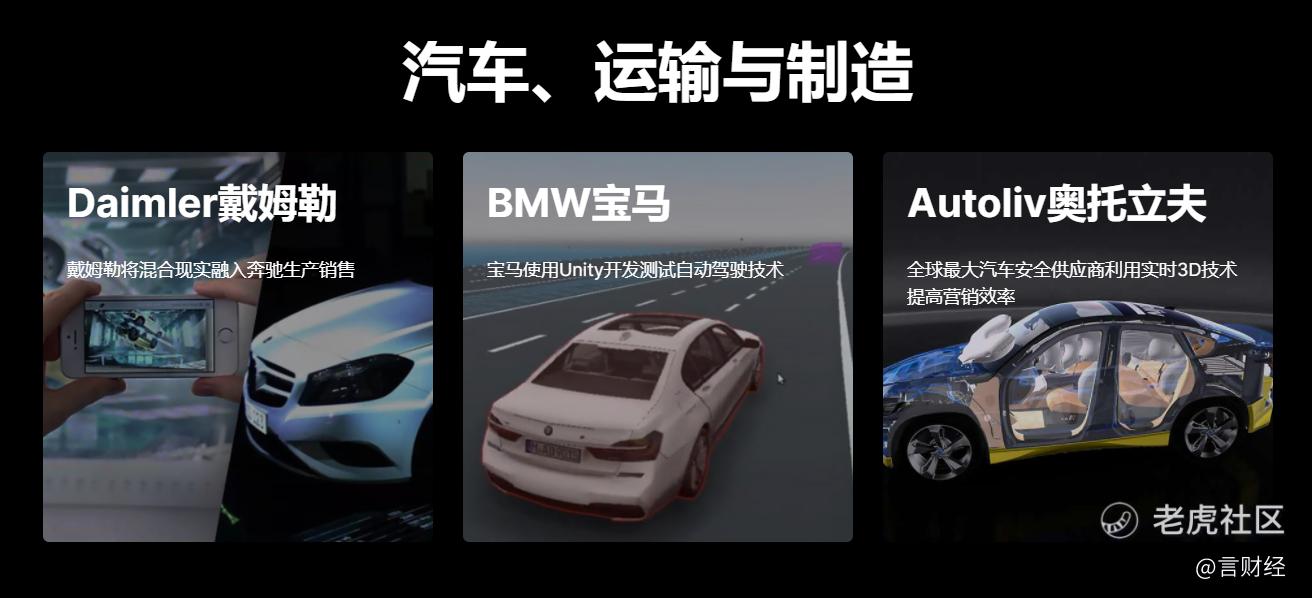 虽然游戏行业还是Unity最大的收入来源,但是公司近些年已经在积极地将这一基础引擎技术应用于更多的行业之中,例如汽车、运输与制造行业,工程建设与数字城市行业等。