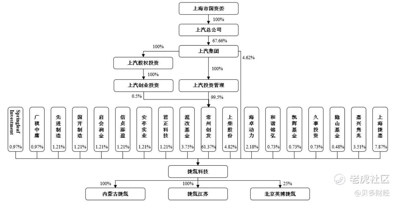 因此,上汽集团合计直接/间接持有捷氢科技68.3011%的股权,为捷氢科技的间接控股股东。上海市国资委通过上汽总公司间接持有上汽集团67.66%的股权,为捷氢科技的实际控制人。