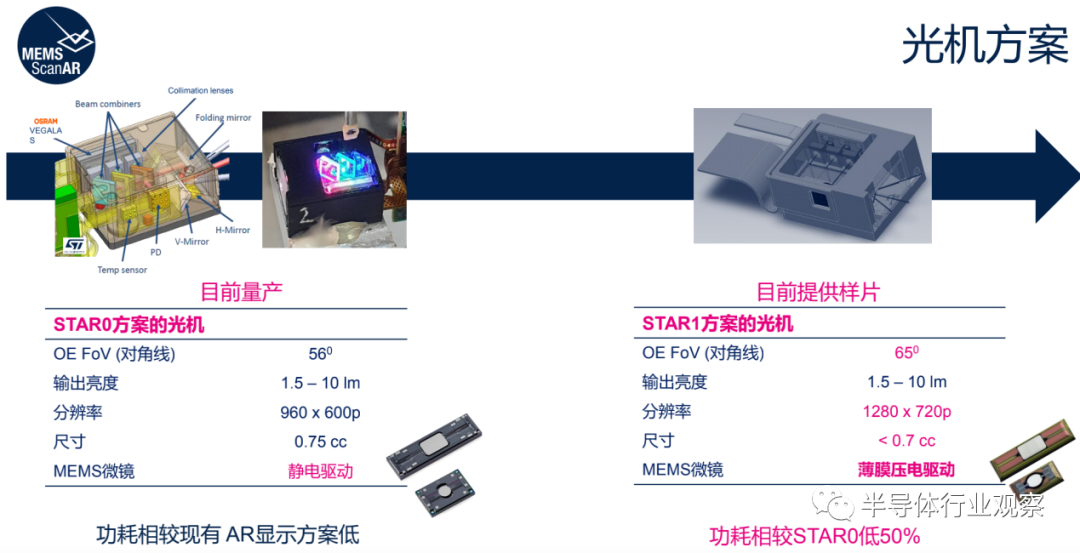 目前ST MEMS ScanAR光机方案有STAR0和STAR1这两种。STAR0的光学对角线可视角 (FoV) 是56度,输出亮度是1.5~10 流明,解析度有600p,光机的尺寸有0.75cc,使用的是静电式的MEMS mirror。STAR1改用了新的Thin Film Piezo MEMS mirror的光机,目前已经有样篇可以提供。STAR1改善了其中几项特性,将光学的可视角提高到了65度,将解析度从600p提高到720p,以符合目前全天候佩戴AR眼镜的需求。此外,在光机尺寸的部分,还可以将光机缩小成小于0.7cc的尺寸。相对于STAR0的光机, STAR1的功耗可以减少50%。