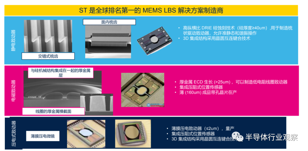 在了解LBS技术之前,先来看下ST在MEMS方面的实力。ST已经在MEMS市场深耕了20 多年。目前ST的运动MEMS在个人电子和汽车远程信息处理市场上的份额高达50%,是消费类MEMS应用市场的第一大厂商,目前出货量已超过 200 亿片;还是第一大微机械致动器厂商,最著名的应用是喷墨打印机。不止于这些,ST还是第一大MEMS微镜厂商,其是全球排名第一的 MEMS LBS 解决方案制造商。