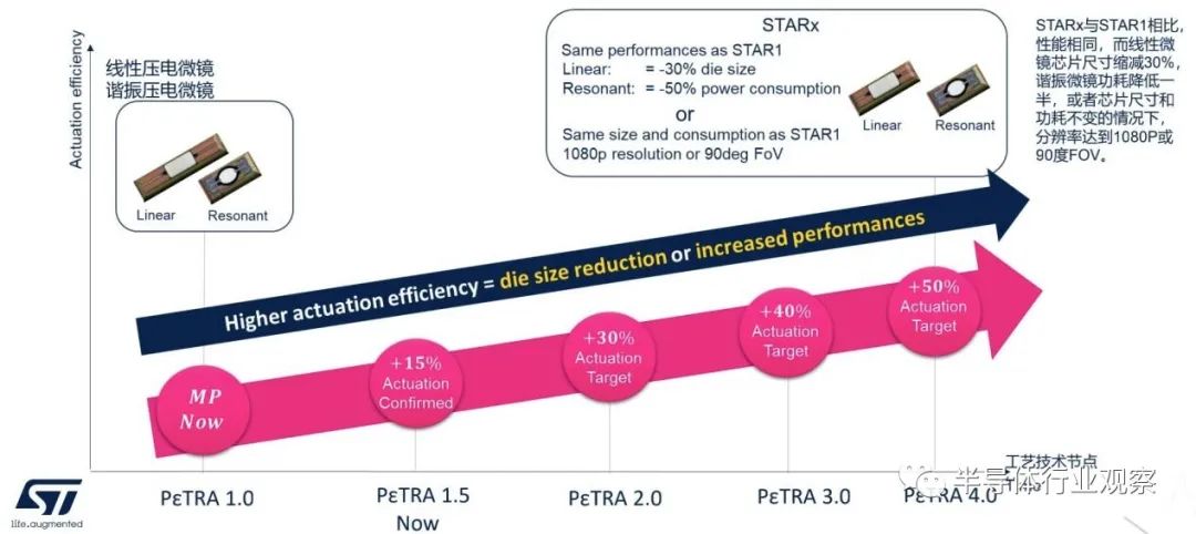 ST也正在量产采用PεTRA 1.0技术的微镜,最近这项技术已经升级到PεTRA 1.5。技术在朝着两个方向发展:减小芯片尺寸或者提高致动性能。下一代的STARx与STAR1相比,性能相同,而线性微镜芯片尺寸缩减30%,谐振微镜功耗降低一半,或者芯片尺寸和功耗不变的情况下,分辨率达到1080P或90度FOV。这足以体现出ST压电致动器工艺规划