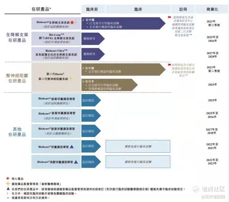 百心安不同开发阶段中拥有一项核心产品及其他八项管线在研产品。其中,核心产品Bioheart®是自主开发的BRS系统,用于经皮冠状动脉介入治疗手术,且根据弗若斯特沙利文的资料,预期将成为全球首个基于多中心随机对照临床试验结果获监管批准的第二代全降解支架系统。百心安采用自主开发的业务模式,并已自主开发用于产品及在研产品的重要技术。对于肾神经阻断在研产品,百心安目前计划在中国、日本和欧洲对产品进行商业化;对于其他在研产品,目前计划在中国对产品进行商业化。根据国家药品监督管理局的分类标准,百心安所有产品及在研产品均属第三类医疗器械。