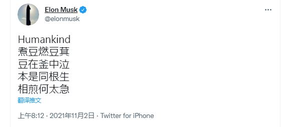 11月2日,马斯克在推特上发文,标题“Humankind”,翻译一下就是“人类”,内容就是4句中文诗“煮豆燃豆萁,豆在釜中泣。本是同根生,相煎何太急。”$特斯拉(TSLA)$