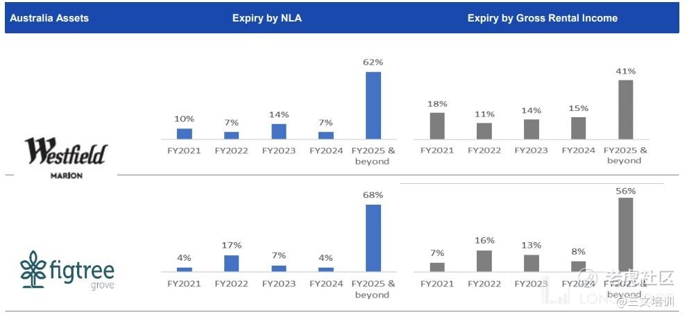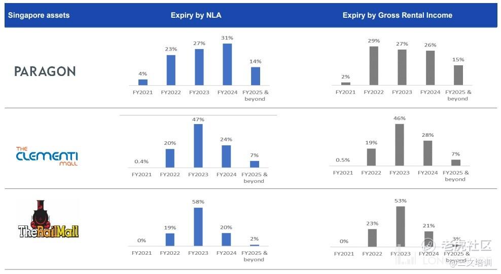我们以 新加坡报业地产 整体产业组合的表现来看的话,在 FYE 2021、FYE 2022、FYE 2023、FYE 2024 和 FYE 2025 以上以 NLA 计算的租凭期限结束的占比分别为 7%、13%、20%、15%、和 45%;若以 GRI 来计算的话则分别是 7%、22%、25%、22%、和 24%。也就是说接下来的两个财政年(FYE 2022 和 FYE 2023)是我们作为投资者需要特别关注的。