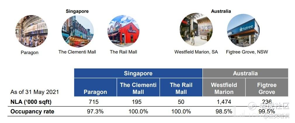 新加坡报业地产 旗下共有 5 个产业,其中 3 个是属于新加坡的零售商场型的产业,剩余的 2 个产业则是坐落在澳洲的市场中,共合 2.7 Million Sq. Ft. 的净可出租面积(“NLA”)。其中 新加坡报业地产 值得留意的就是公司旗下的商场出租率,The Clementi Mall 和 The Rail Mall 两个商场的出租率都达到了 100.0%;综合公司整体平均出租率为 98.4%,这一点是非常不错的。