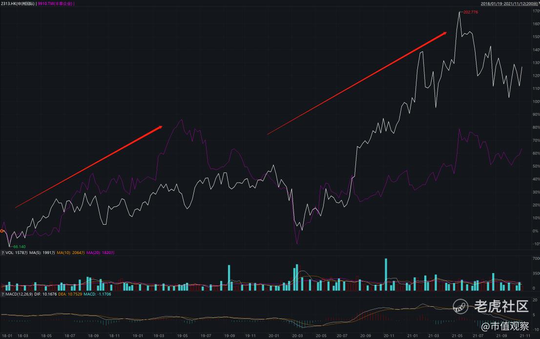 较高的盈利水平与业绩增速继而推动这些公司股价持续攀高,演绎牛股行情。仅以运动鞋服两大代工龙头为例,过去三年间(2018年至今),申洲国际与丰泰企业股价连续经历两轮上涨,期间申洲国际股价累计涨幅超过130%,丰泰企业则超过65%。