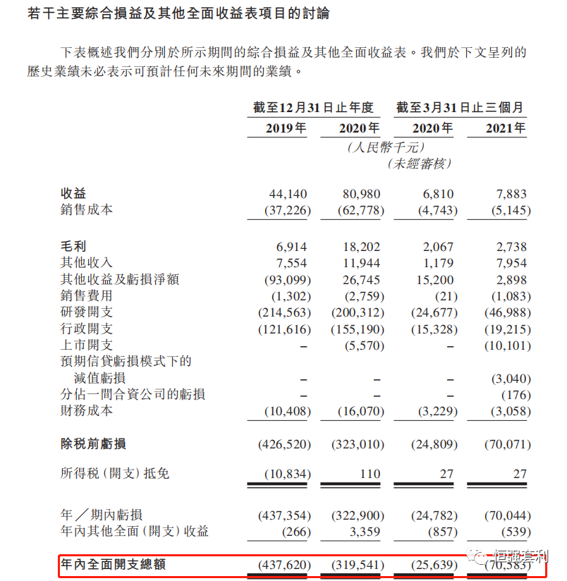 招股书显示2019年2020年12月31日止年度,公司的年内全面开支总额分别为人民币4.37亿元及人民币3.20亿元。