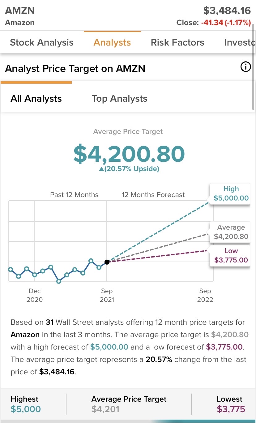 $Amazon.com(AMZN)$Based on 31 Wall Street analysts offering 12 months price target. The average target price is 4,200.80 with a high forecast of 5,000 and low forecast of 3,775. The average price target represents a 20.57% up from the last price. What do you think?