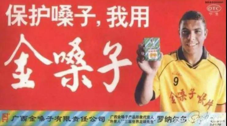 国民润喉糖“金嗓子喉宝”,在中国可谓无人不知。“保护嗓子,请用金嗓子,广西金嗓子!”,相信不少中国人对这句广告词记忆尤深。一到央视频道晚间黄金时段,这段极具魔性的广告就会循环播放。 画面中,罗纳尔多手举一盒东方润喉片,露着两排牙齿憨笑,衣服上还印着醒目的红色logo“金嗓子喉片”。