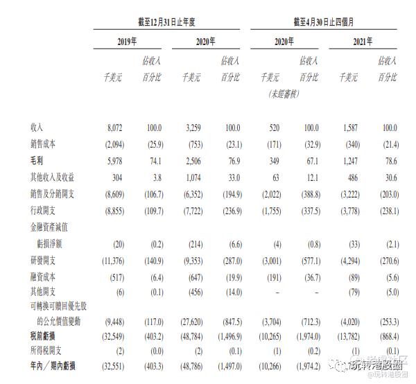 2019年到2020年分别净利亏损3255.1万美元与4878.6万美元。
