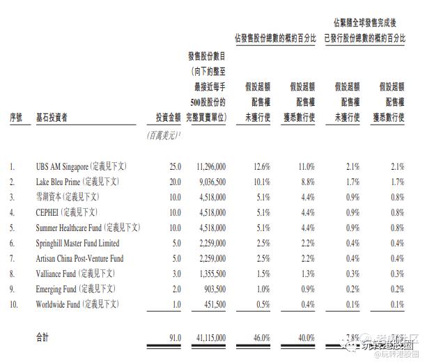 基石投资者方面,多名基石投资者同意按发售价认购可供认购的发售股份数目,总额约9100万美元,包括UBS、清池资本、雪湖资本、鼎晖投资、Summer Healthcare Fund、Springhill Master Fund Limited、Artisan China Post-Venture Master Fund LP、Valliance Fund、Emerging Markets Healthcare Partners LLC、及Worldwide Healthcare Partners LLC。