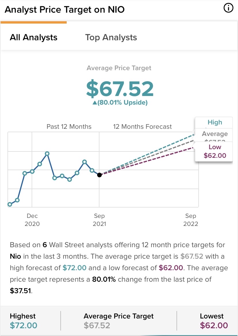 Based on 6 Wall Street analysts offering 12 months target price, $NIO Inc.(NIO)$has an average target price of $67.52, representing 80% upside potential.