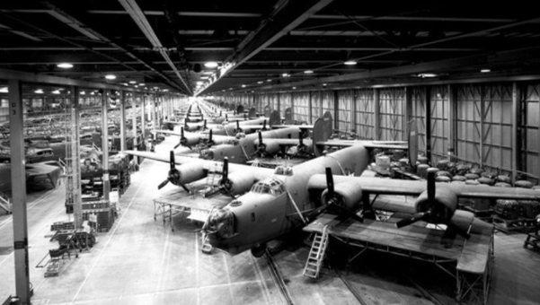 福特车辆制造厂成为全世界最大的车间。车间里有一条装配线长达半英里,每小时可以生产一架30吨重的轰炸机。