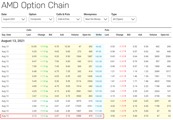 如果后面AMD的股价确实回调了,股价低于112美元的行权价,这张期权的买方不会行权,你可以获得213美元。如果后面AMD的股价继续上涨,超过了112美元的行权价,买方行权,你需要把持仓中的100股AMD卖给买方,在这种情况下,你依然可以获得213美元。
