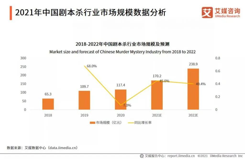 艾媒咨询《2021年中国剧本杀行业发展现状及市场调研分析报告》显示:2019年中国剧本杀市场规模达109.7亿元,同比增长68%;2020年即便线下店受疫情冲击明显,但行业整体仍逆势实现7%增速。2021年预期增速重回45%,市场规模达到170.2亿元。