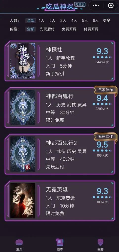 2021年2月上线的吃瓜神探,目前累积用户在5万左右。但与偏重社交的传统剧本杀不同,创始人陈仲纬在接受采访36氪时表示,“我们给自己的定位是剧本杀界的‘快看漫画’,会注重内容沉淀和娱乐沉浸感。”