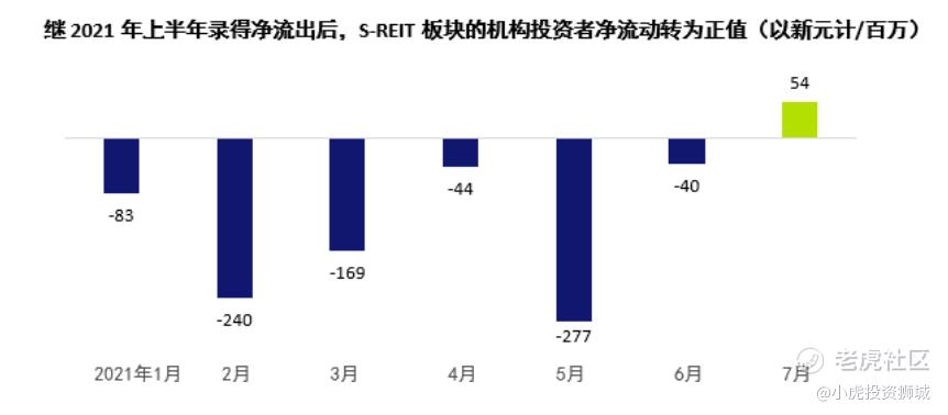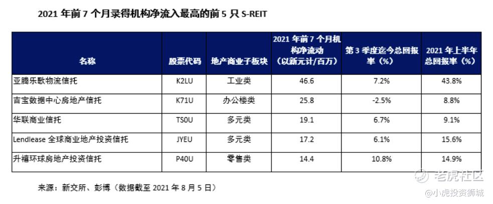亚腾乐歌物流信托(+4,670万新元)、吉宝数据中心房地产信托(+2,580万新元)、华联商业信托(+1,910万新元)、Lendlease全球商业地产投资信托(+1,720万新元)和升禧环球房地产投资信托(+1,440万新元)是2021年前7个月录得机构净流入最高的前5只S-REIT。