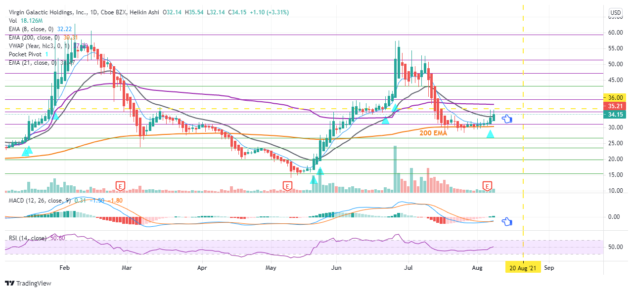 $SPCE has been holding well along the 200 days moving average. With both MACD and the 8/21 days EMA about to crossover, look out for $SPCE to make a strong move within the next 1-2 weeks. 20/Aug $36C looks good. Good luck to all $SPCE fans. Cheers.