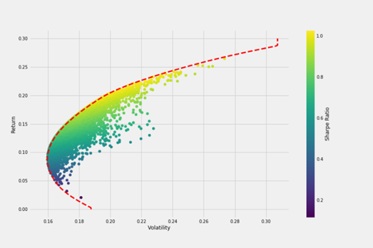 首先,投资组合可以分散风险,我们都听说过不要把鸡蛋都放在一个篮子里。而且,在行为金融学中讲述了大部分人都有过度自信的行为偏差,对自己熟悉的事物更愿意投入,尤其是如果他们所在的公司或者行业蒸蒸日上的时候,例如乐视的员工买乐视、康得新的员工买康得新、安然的员工买安然。但是后来黑天鹅来了,这三波员工的快乐,啪地一声!没有了。投资组合首先可以避免投资者血本无归。其次,风险和收益往往有密切的关系。在这里要说一下著名的现代资产组合理论,在这个理论中,波动率代表风险,收益率代表回报。每个资产都有一组波动率和收益率数据,进而由资产组成的组合也有一组波动率和收益率数据。通过统计各种不同的组合数据,并标记到坐标轴中,在这个图中,纵坐标为收益率,横坐标为波动率,由此可以得到资产组合的收益和风险之间的关系图。从图中可以清楚地看到,最左边的组合在收益率相同的情况下,波动率最小,如果将这些组合连起来就可以得到一条著名的曲线,叫组合前沿曲线,也叫有效前沿。