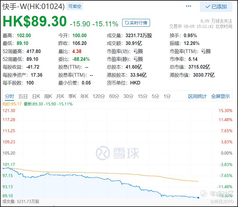 8月5日,港股上市公司快手迎来最黑暗的一天,哦,不,应该是继续黑暗的一天,截至下午3点,快手跌幅高达15%,股价89.3港元,再次刷新历史新低,已经跌破115港元的发行价,较历史最高价下跌了80%。