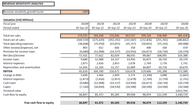 为了验证我们前面的分析,即供应限制、服务部门收入放缓和不利的外汇对销售产生的不利影响只是暂时的,不会实质性改变 Apple 的上行潜力,我们还进行了敏感性分析,以量化对2021 财年的收入需要将我们 170.91 美元的基本价格目标降低 10%。