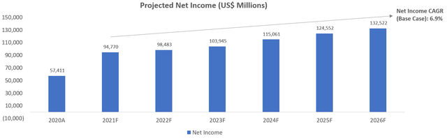 总的来说,我们的基本案例预测预计 2021 财年的净收入为 948 亿美元,同比增长 65%。预计未来五年底线将以 7% 的复合年增长率进一步增长,预计到 2026 年净收入将达到 1325 亿美元。