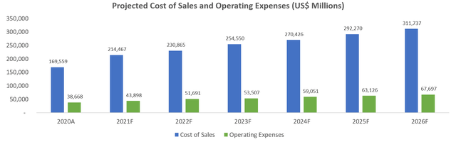 因此,我们的基本案例预测预计 2021 财年的总销售成本为 2145 亿美元,总运营费用为 439 亿美元。预计 2026 财年将采用类似的成本结构,以支持 Apple 产品和服务的持续增长类别,以及它目前经营所在的所有地理区域。