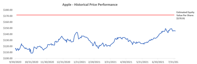 考虑到今年迄今为止的总净销售额为 2825 亿美元,苹果只需在 9 月季度实现总净销售额 190 亿美元即可维持 2.5 万亿美元或每股 153.82 美元的预计股权价值,即使供应不足也不太可能基于公司当前的增长轨迹,约束压力和服务部门销售额减少。因此,我们不认为与供应限制、服务部门收入放缓和不利外汇相关的近期影响是导致 Apple 估值永久损失的催化剂。