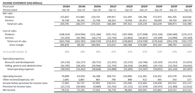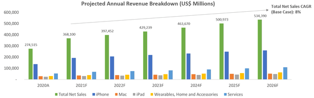 我们预计 9 月季度的总净销售额包括 676 亿美元的产品销售额,比上年增长 35%,以及 180 亿美元的服务销售额,比上年增长 24%。总之,我们的基本案例预测预计 2021 财年的总净销售额为 3681 亿美元,同比增长 34%。由于越来越多地采用技术和数字媒体并将其整合到日常工作的专业和个人方面,该公司的净销售额预计将以 8% 的复合年增长率保持加速增长,到 2026 财年达到 5,344 亿美元。