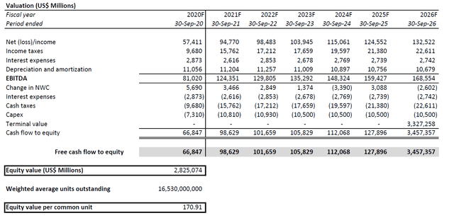 根据我们的敏感性分析,2021 财年的收入为 3015 亿美元,到 2026 年的复合年增长率为 10%,同时保持上述所有其他估值假设(即成本结构、WACC、EV/EBITDA 倍数)不变,将导致价格目标价为 153.82 美元,比我们的基准价格目标 170.91 美元低 10%。