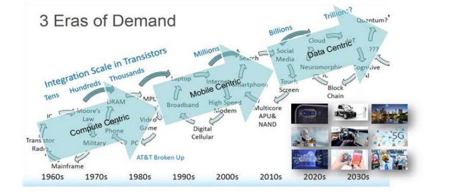 自互联网科技快速发展以来,集成电路历经着三次产业变革。第一次变革驱动是计算时代,以个人电脑为代表。第二次变革驱动是移动时代,以智能手机为代表。第三次变革驱动是数据,围绕的是数据的产生、传输、存储、分析四大维度进行。