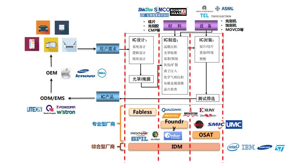 随着全球集成电路的产业转移,目前下游IC封装测试环节已转移到中游IC制造环节,同时综合厂商也由原来的以IDM为主逐渐转变为以Fabless、Foundry、OSAT专业厂商为主进行细分工。至此,IC产业链里的每个环节分工明确。