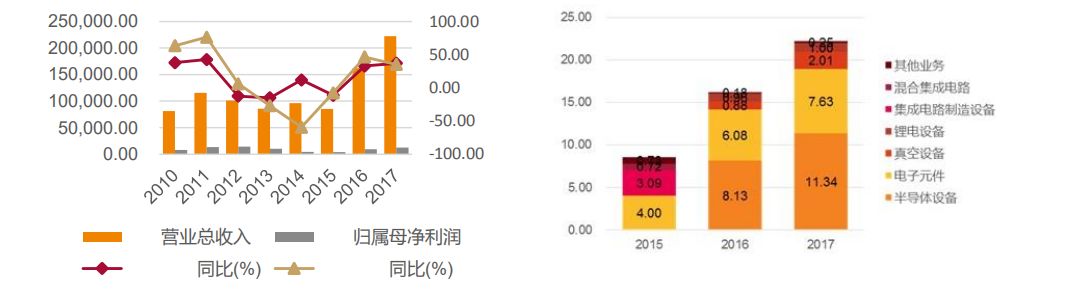 北方华创公司由七星电子和北方微电子战略重组而成,主要产品包括高端电子工艺装备和精密电子器件。公司构建了半导体装备、真空装备、新能源锂电装备和精密电子元器件四大产业平台,尤其在重组后,公司战略规划、定位更加精准。2018年,北方华创实现营业收入33.24亿元,同比增长49.53%,归属于上市公司股东的净利润2.34亿元,同比增长86.05%。其中电子工艺装备实现营业收入25.21亿元,同比增长75.68%。电子元器件实现营业收入7.88亿元,同比增长3.23%。