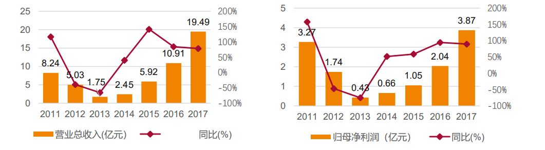 晶盛机电公司是国内技术先进的光伏及半导体晶体硅生长设备供应商,主要产品有单晶生长炉、多晶硅铸锭炉、蓝宝石晶体炉、区熔硅单晶炉、单晶硅滚圆机、单晶硅截断机等。公司下游客户涵盖了除隆基以外的所有硅片厂家,包括中环、晶科、晶澳、保利协鑫等。公司近年来业绩继续保持高增长趋势。2013-2016年,营业收入和净利润复合增长率分别高达84%和68%。2017年营业总收入19.49亿元,同比增长78.55%,归母净利润3.87亿元,同比增长89.76%。