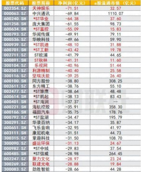 亏损额最高的是天神娱乐,市值44亿,却创下71.51亿元巨亏记录,堪称“雷王”。排第二位的则是受到美国巨额罚款制裁的中兴通讯,全年巨亏70亿。