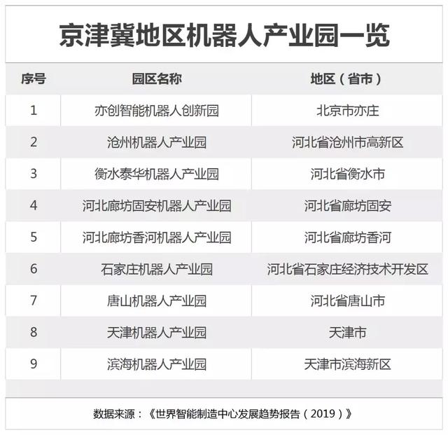 京津冀地区共有机器人产业园9家,北京1家、河北6家、天津2家。这些机器人产业园成为京津冀机器人资源的最重要聚集地。