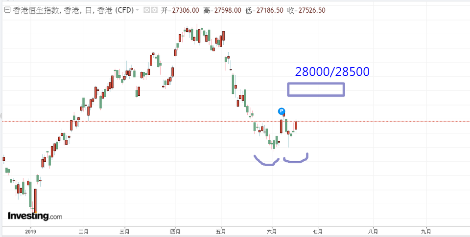 而恒生指数也一样,在短线中出现一个小双底,反弹目标在28000/28500左右。唯短线必须留意19/6,及6月24日的江恩转势日,可能在此时反弹会受阻。所以目前游击的策略是必须