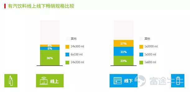 特别有意思的是尼尔森的报告有一页对有汽饮料的包装规格对线上线下消费的影响做了研究,并给出了一个建议:为线上与线下渠道设计出不同的包装规格,细微的促销战略,可以带动整体销量的增长。