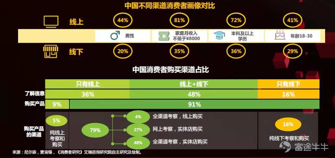 还有一个更重要数据是家庭月收入,线上的购物者比线下的购物者收入高的占比高出46%。不仅收入高的居多,学历高的也比线下高出许多,其次是更加年轻化。