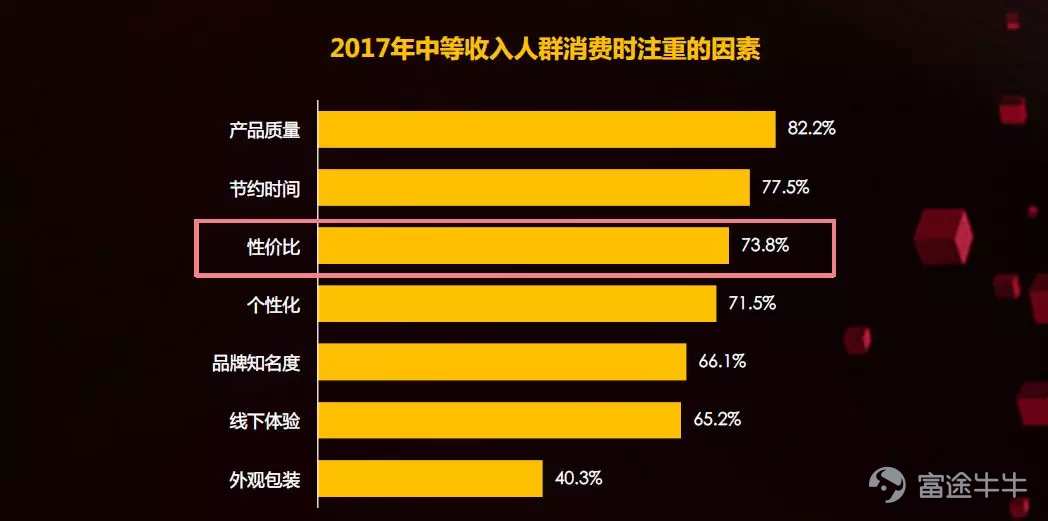 《2018中国零售商超全渠道融合发展年度报告》的数据显示,中国中等收入人群消费时除关注产品质量及时间外,有73.8%的消费者在消费时更关注商品的性价比。